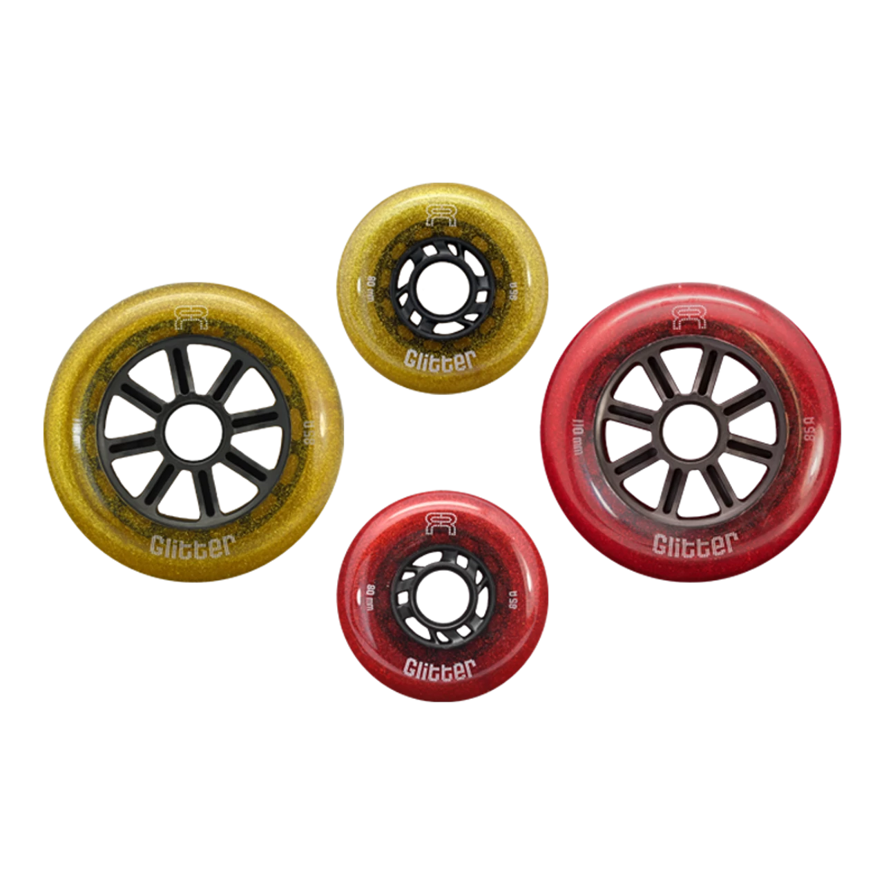The new FR Glitter Inline Wheels are, well, pretty frickin’ fantabulous. Coming in two different colors, Red and Gold. They come in three different sizes, 76mm, 80mm, and 110mm. These wheels are soft enough for outdoor skating and hard enough for indoor skating. Sold as individual units.