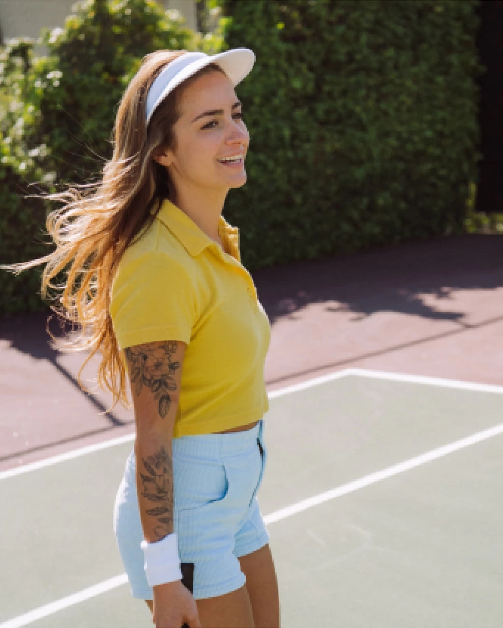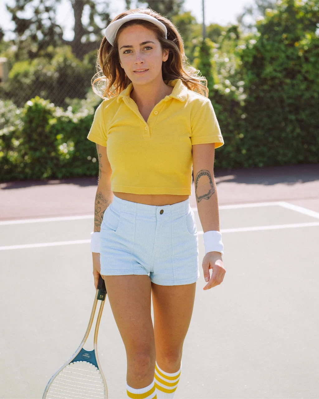 The Terry Polo is the newest addition to our terry cloth collection and our most versatile top to date! Dress it up for disco night with the bells, dress it down for pool day with the bikini, or pair it with the shorts for just about any other occasion. The Terry Polo is true to its 1960s counterparts with disco collar, deep placket, and tailored fit. After wearing many vintage terry polos over the years and almost a year of development, we are very happy to offer our he women’s style is based on a combination of our two favorite vintage terry tees and is made to be worn with our shorts.