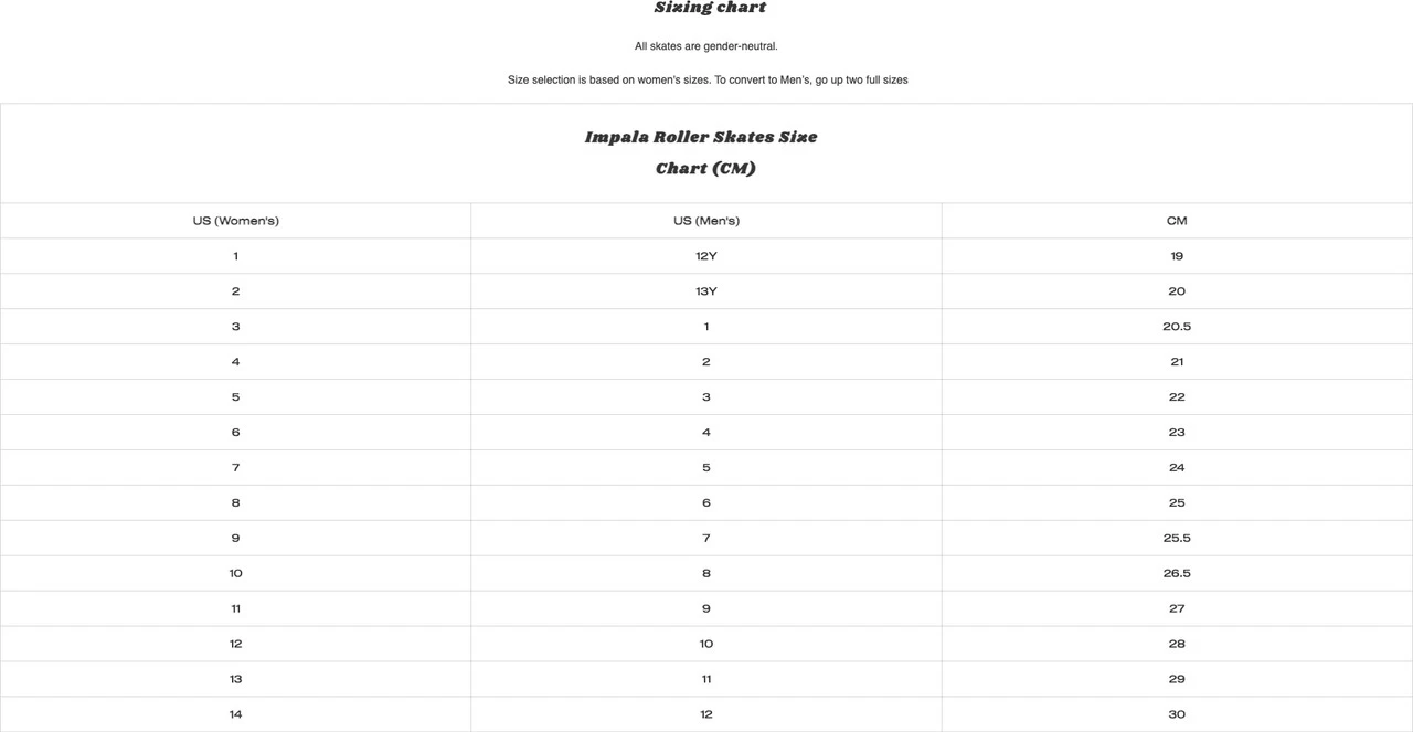 | Size | Womens 1 / Youth 12, Womens 2 / Youth 13, Womens 3 / Mens 1, Womens 4 / Mens 2, Womens 5 / Mens 3, Womens 6 / Mens 4, Womens 7 / Mens 5, Womens 8 / Mens 6, Womens 9 / Mens 7, Womens 10 / Mens 8, Womens 11 / Mens 9, Womens 12 / Mens 10, Womens 13 / Mens, Womens 14 / Mens |